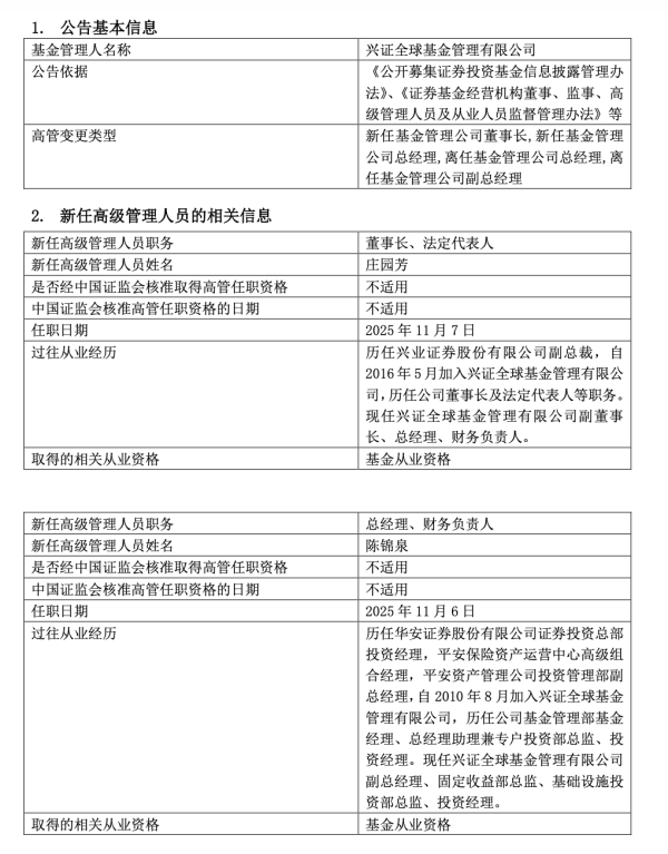 体育游戏app平台 11月7日晚,兴证群众基金发布高档处分东谈主员变更公告称,公司总司理庄园芳出任公司董事长、法定代表东谈主,公司副总司理陈锦泉升任公司总司理,并任公司财务谨防东谈主。 图片起原:基金公告 尊府高傲,庄园芳是有着逾33年从业栽植的资管宿将。1992年,庄园芳加入兴业证券(601377);2005年任兴业证券副总裁,摊派公司自营投资、商榷、机构、固定收益等业务板块;2016年任兴证群众基金董事长,2017年兼任公司总司理,后转任公司总司理。 在掌舵兴证群众基金指标处分的十年间,庄