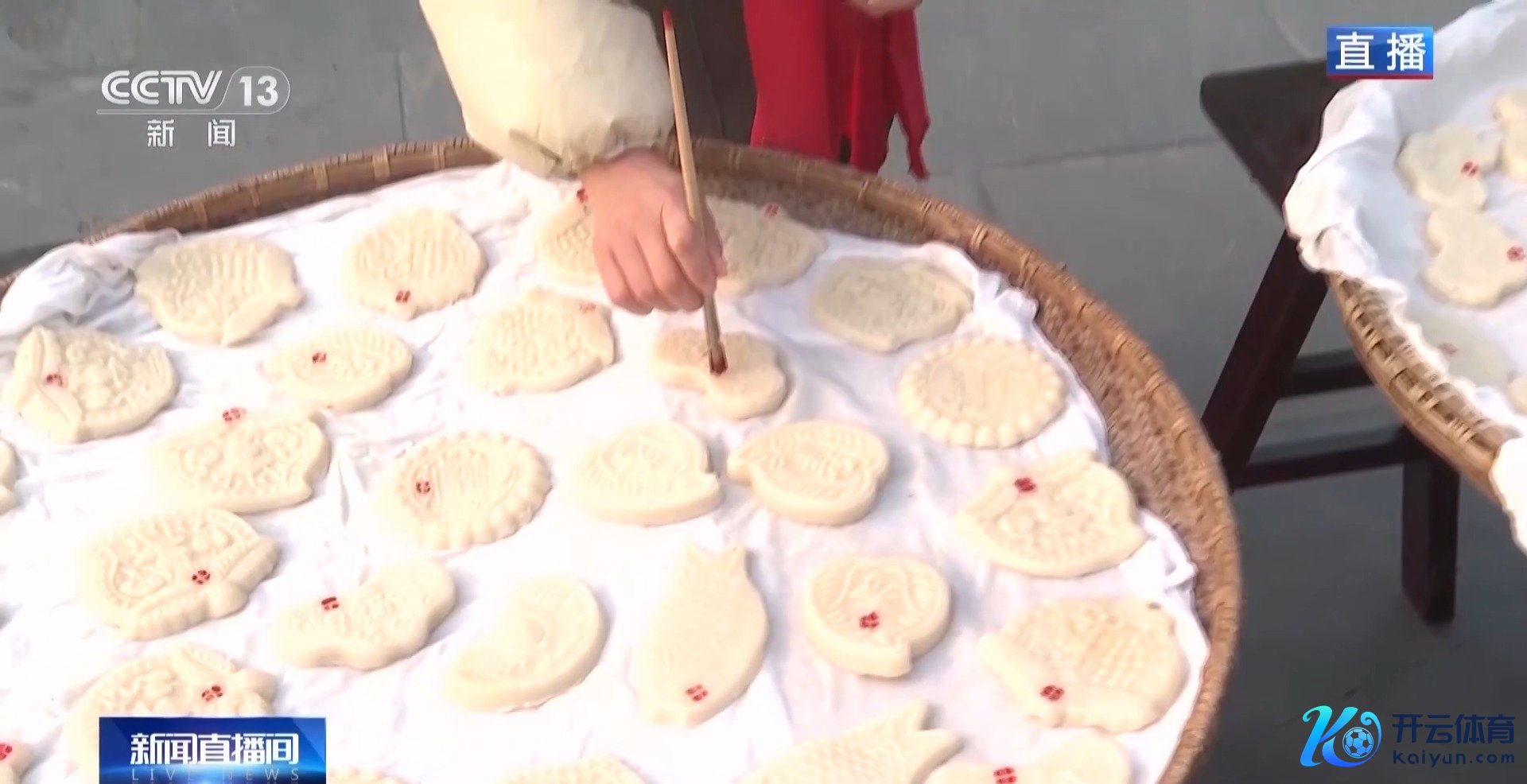 把粉团摁进模具里,然后按压、抹平至紧实。有着各类吉利图案的食桃就初步完成了。终末还要进行“点红”。打出来的有寿桃形、元宝形、鱼形,这些寓意好意思好的图案都是对新一年的祈福。
