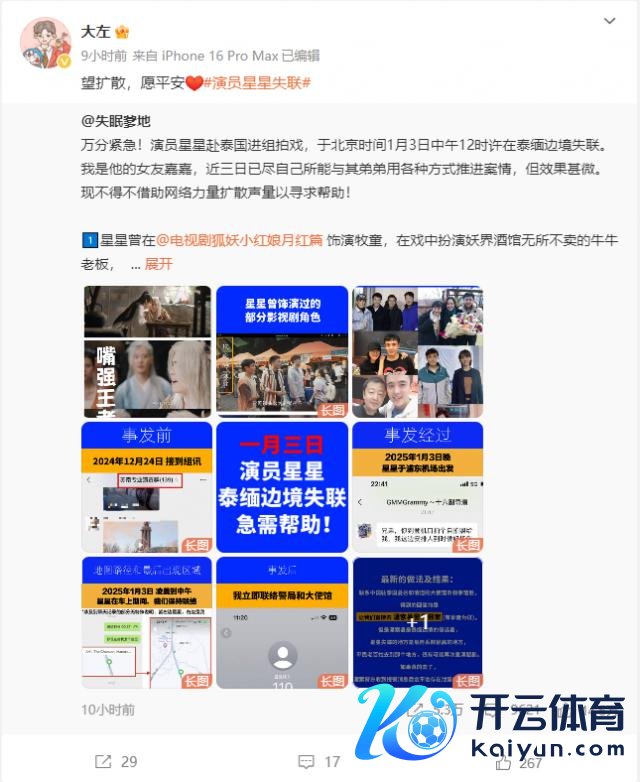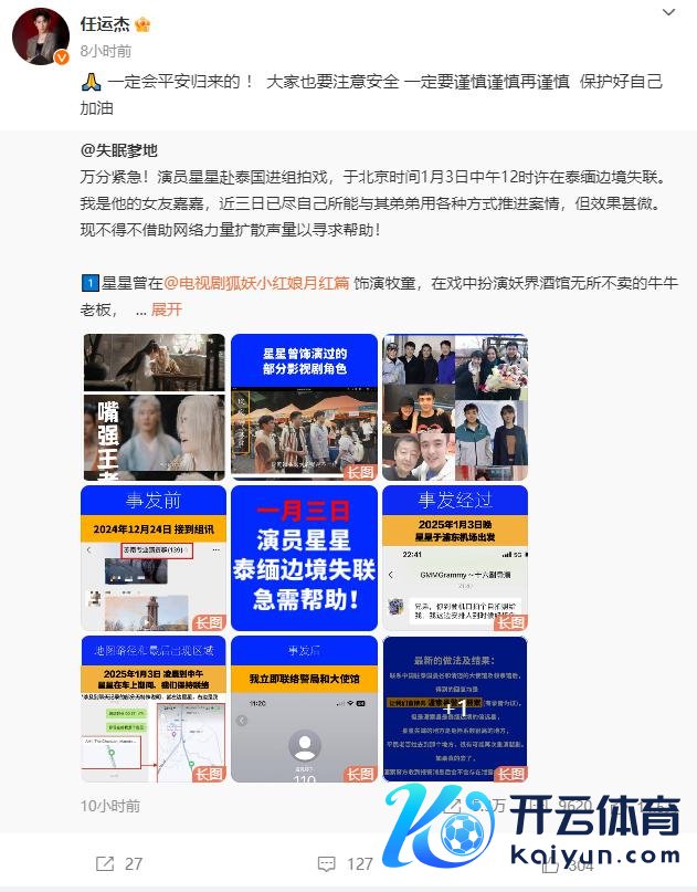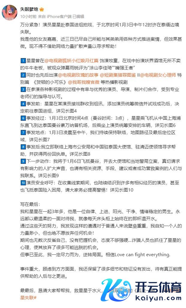 1 月 5 日晚间,微博账号"失眠爹地"发出了一篇长文。她自称是演员星星的女友嘉嘉,星星在赴泰国进组拍戏后,于北京工夫 1 月 3 日中午 12 时许在泰缅边境失联。