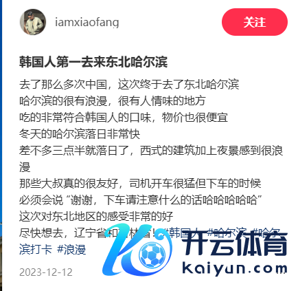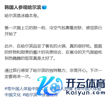 记者细心到,许多韩国游客在酬酢平台晒出了我方在哈尔滨旅游的阅历。