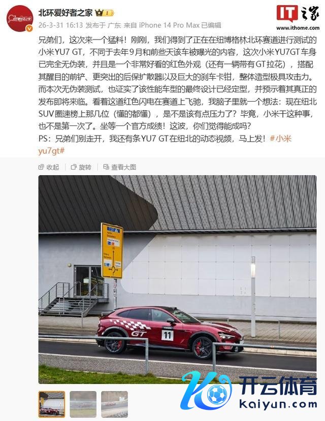 10、小米 YU7 GT 无伪装实车曝光:红色外不雅 + GT 拉花、配遍及刹车卡钳,正在纽北赛谈进行测试