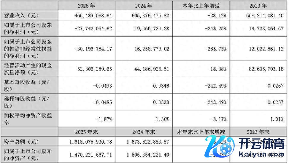 4月17日,建新股份(300107)露出2025年年度敷陈。2025年,公司杀青交易总收入4.65亿元,同比下降23.12%;归母净利润亏本2774.21万元,上年同期盈利1936.57万元;扣非净利润亏本3019.68万元开云体育,上年同期盈利1625.88万元;策动活动产生的现款流量净额为5230.63万元,同比增长18.38%;敷陈期内,建新股份基本每股收益为-0.0493元,加权平均净财富收益率为-1.87%。