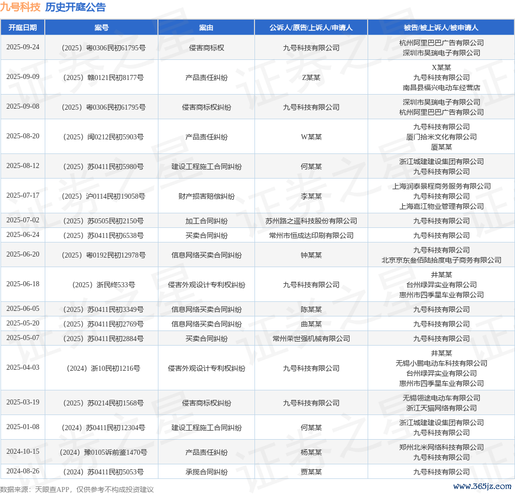 案号:(2025)苏0411民初5980号审理法院:常州市新北区东谈主民法院案由:设立工程施工协议纠纷当事东谈主信息: 原告/上诉东谈主:何某某 被告/被上诉东谈主:浙江城建设立集团有限公司、九号科技有限公司开庭日历:2025年8月12日把柄统计,近一年内以九号科技有限公司为当事东谈主的历史开庭公告有18则,其中案由为“产物职守纠纷”的公告以3则居首,其次为“信息网罗交易协议纠纷”有3则,“交易协议纠纷”有2则。历史开庭公告如下: