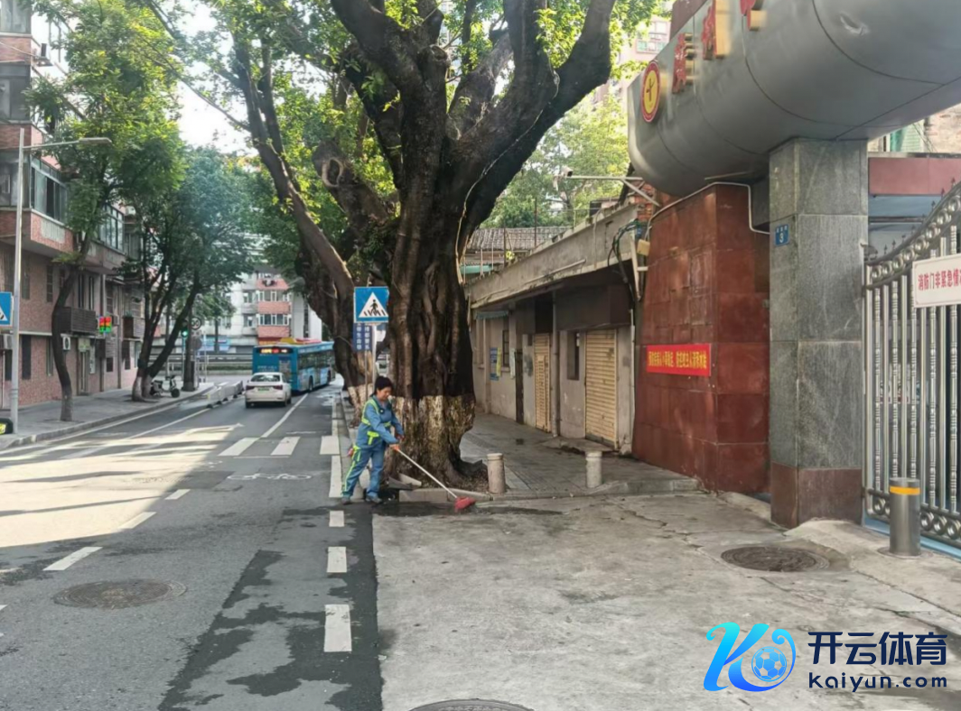 环卫工东谈主对广州一中近邻路面进行保洁。